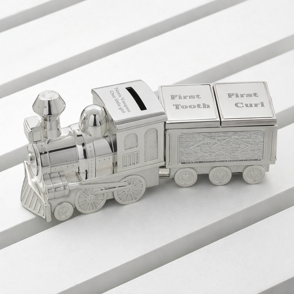 Personalised Silver Plated Train Money Box with First Tooth and Curl Carriage. Celebrate the joy of a little one’s special day with our Personalised Silver Plated Train Money Box featuring a First Tooth and Curl Carriage. This charming keepsake beautifully blends sentimentality with functionality, offering a delightful way to store precious coins while creating a wonderful memory.