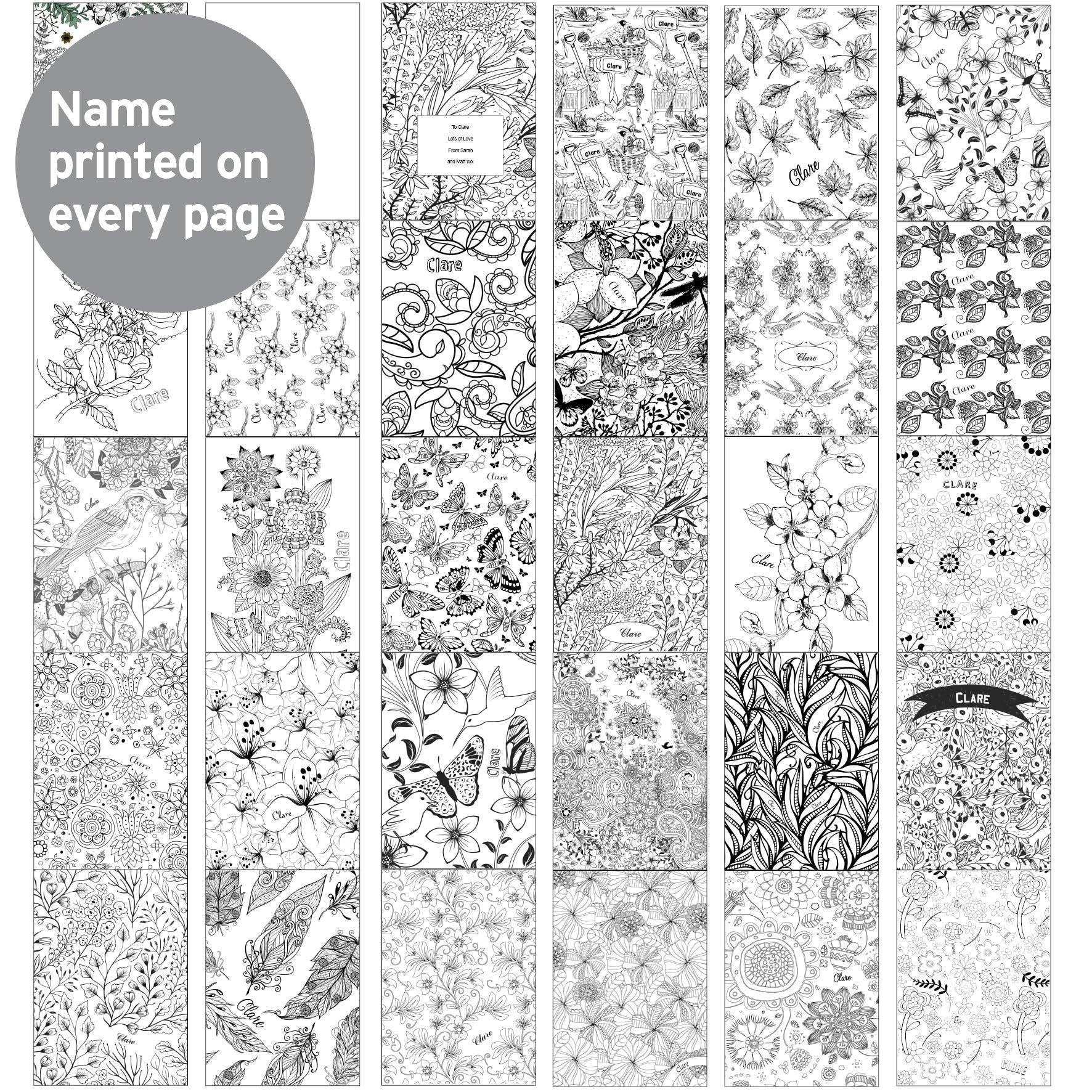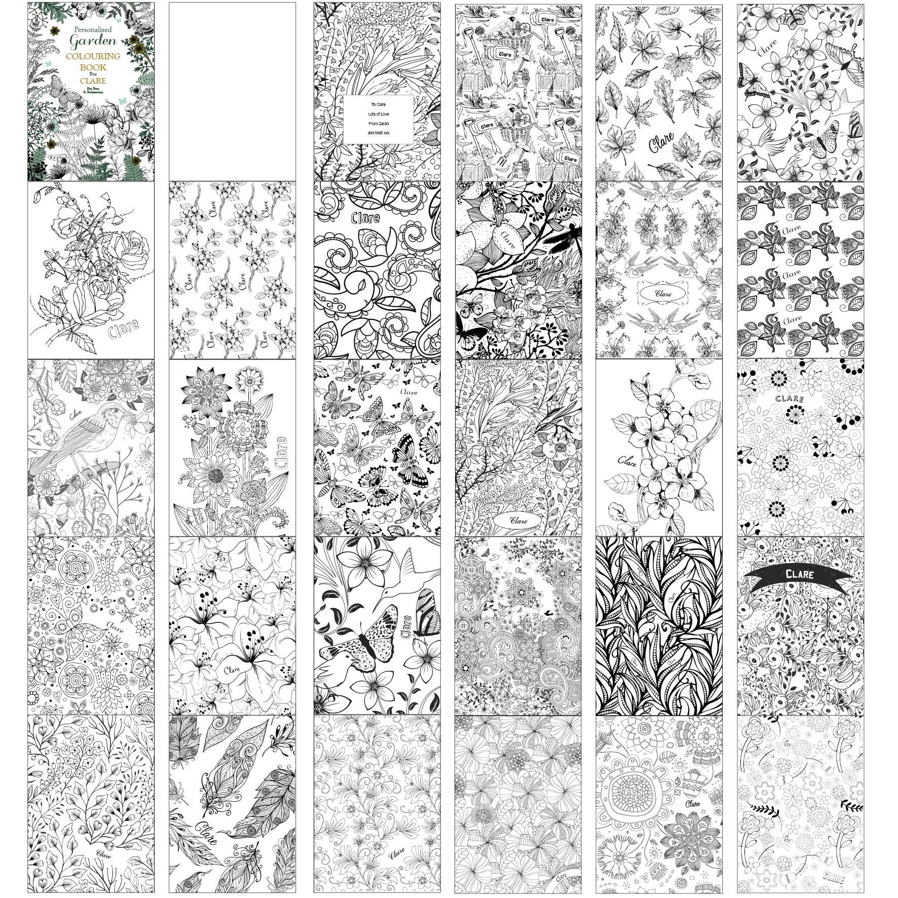 This personalised Garden Colouring Book can be personalised with a name up to 12 characters. (this will also appear throughout the book, on each page). You can then add a message over 4 lines of up to 20 characters per line (this will appear on the inside page).