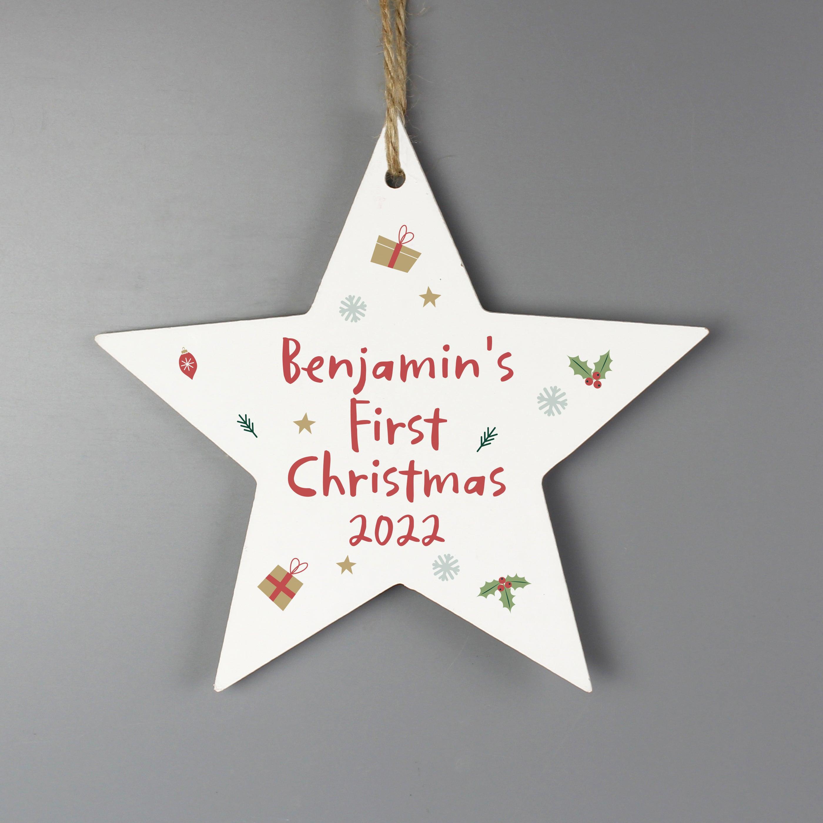 Personalised First Christmas Wooden Star Decoration. Our Personalised First Christmas Wooden Star Decoration is a perfect way to celebrate baby's special first Christmas.