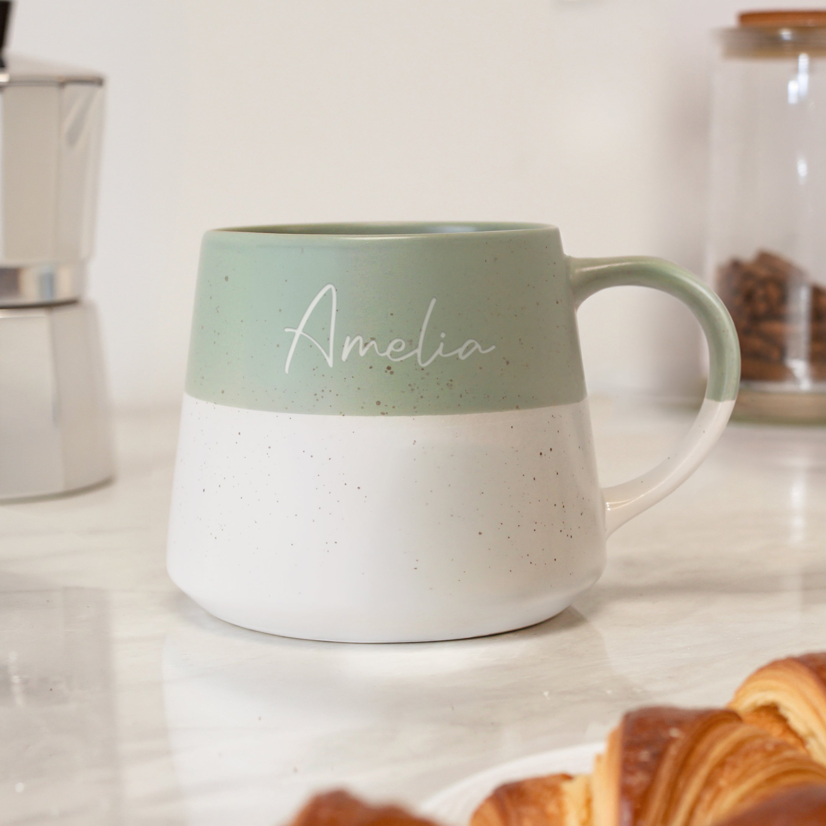 Personalised Name Green Speckled Ceramic Mug. Elevate your daily rituals with this refined green speckled ceramic mug, elegantly personalised with a name of your choosing. The subtle speckled detailing creates a sophisticated aesthetic that complements any kitchen or office setting, whilst the premium ceramic construction guarantees longevity and superior thermal properties. This thoughtfully crafted piece seamlessly merges functionality with bespoke personalisation, making it an ideal choice for discerning individuals who appreciate quality and attention to detail. Whether presented as a distinguished gift or reserved for personal enjoyment, this mug transforms routine beverage moments into occasions of understated elegance. Its timeless design ensures it remains a cherished companion through countless mornings and quiet afternoons.