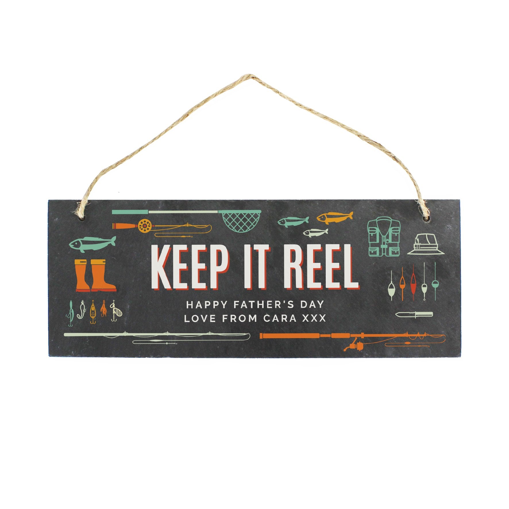 Personalised "Keep It Reel" Printed Hanging Slate Plaque. This personalised slate hanging decoration is the perfect catch for any keen angler.