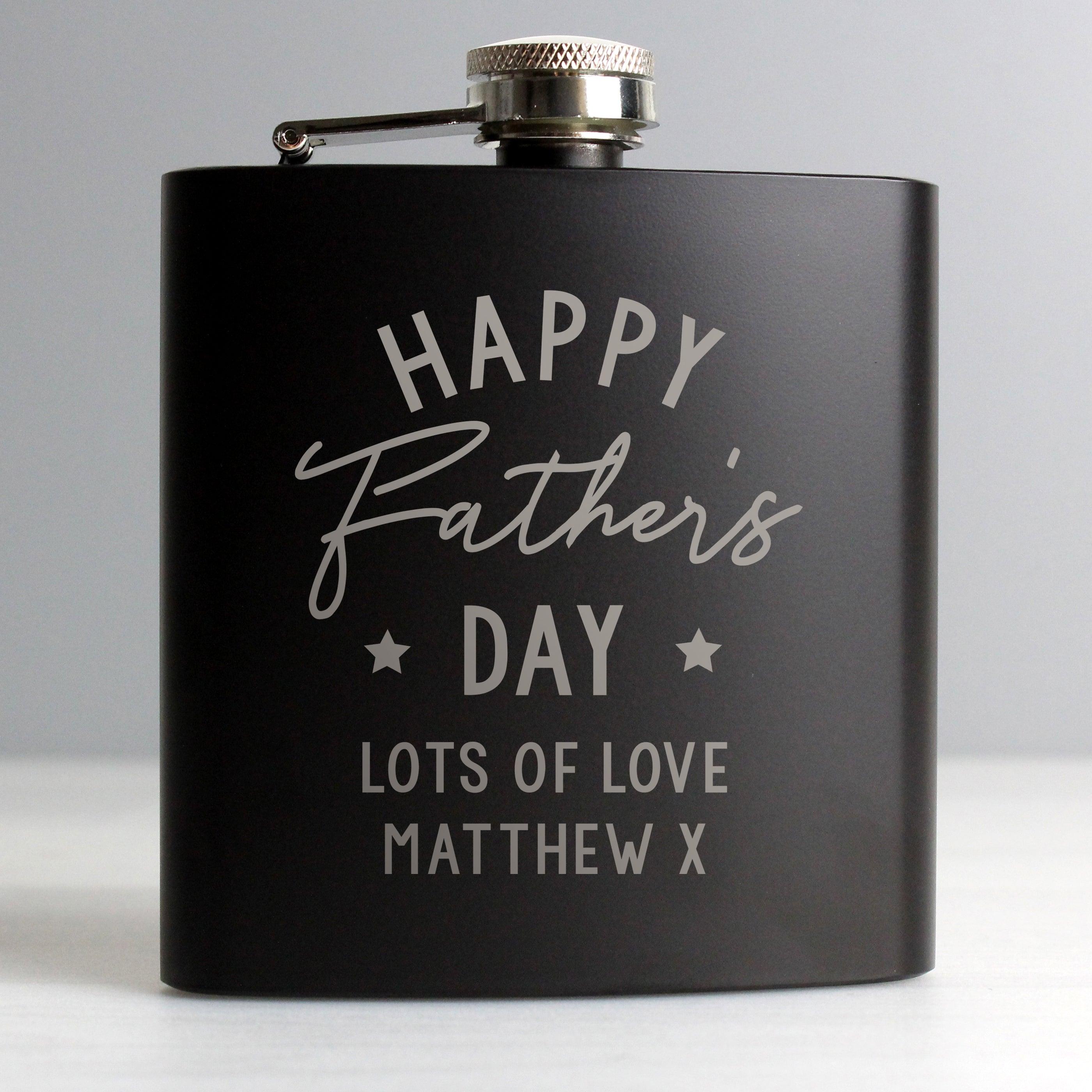 Personalised Father's Day Black Stainless Steel Hip Flask. This black flask is perfect to hold Dad's favourite tipple!
