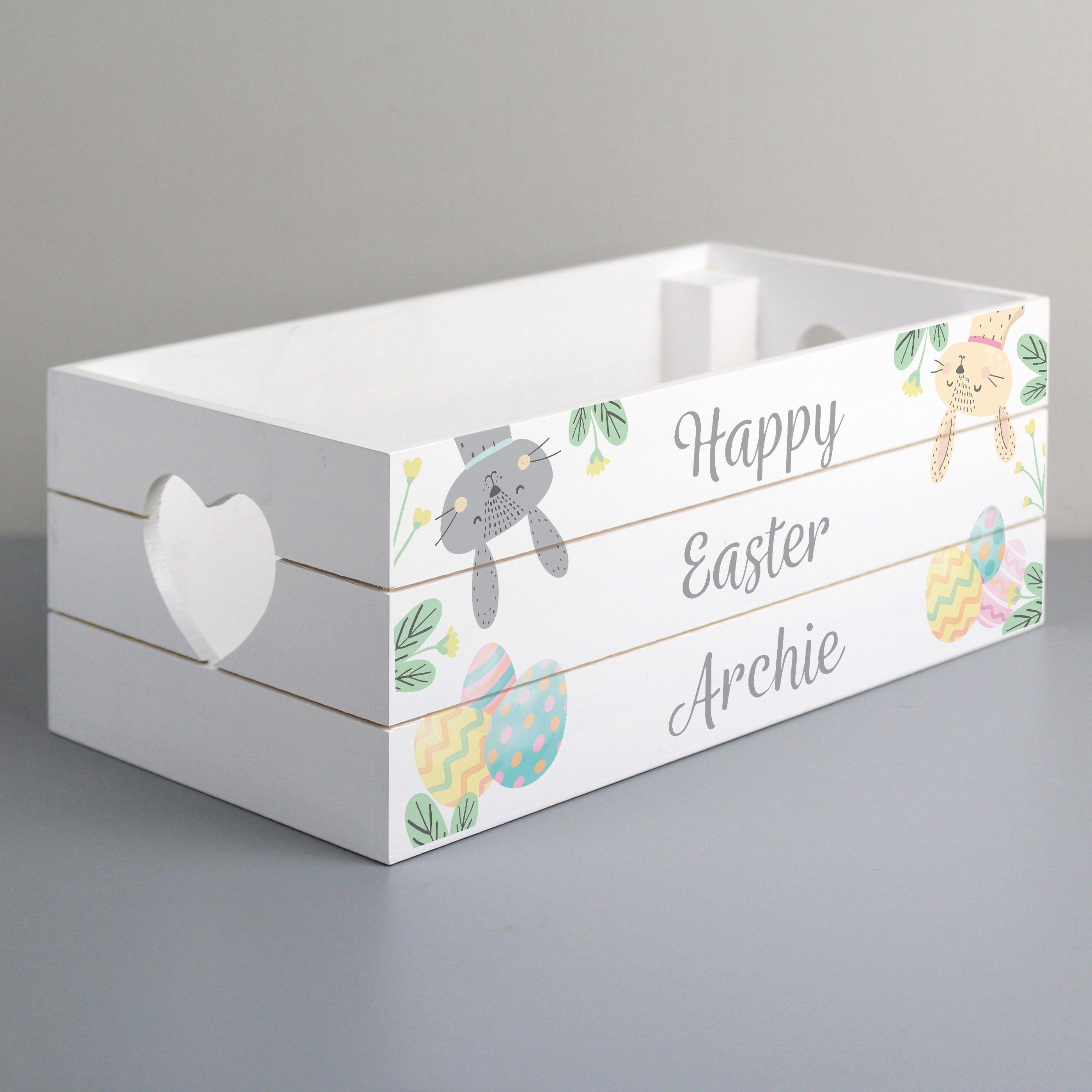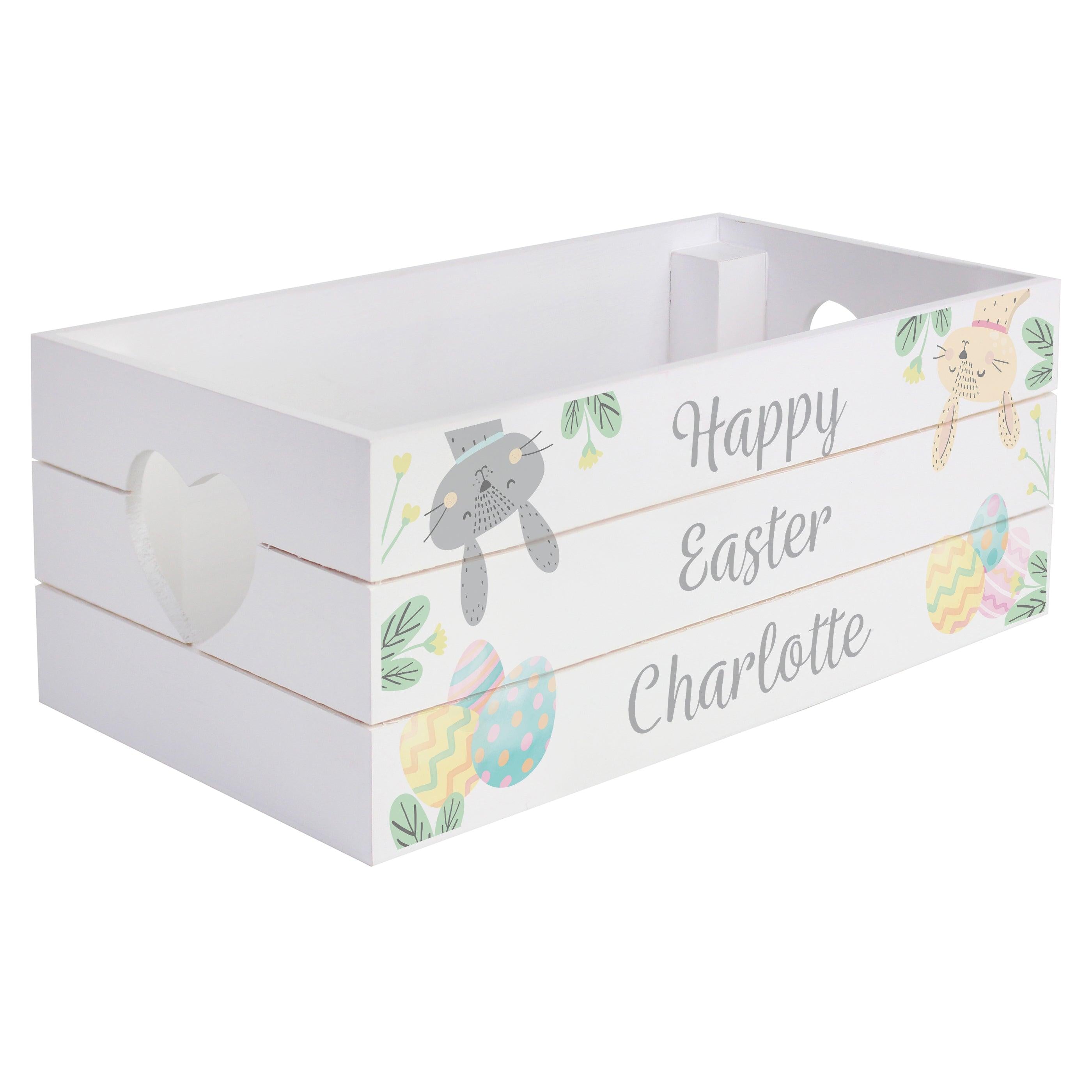 Personalised Easter White Wooden Crate. This personalised Easter crate is perfect for collecting your Easter treats in while you are on your egg hunt.