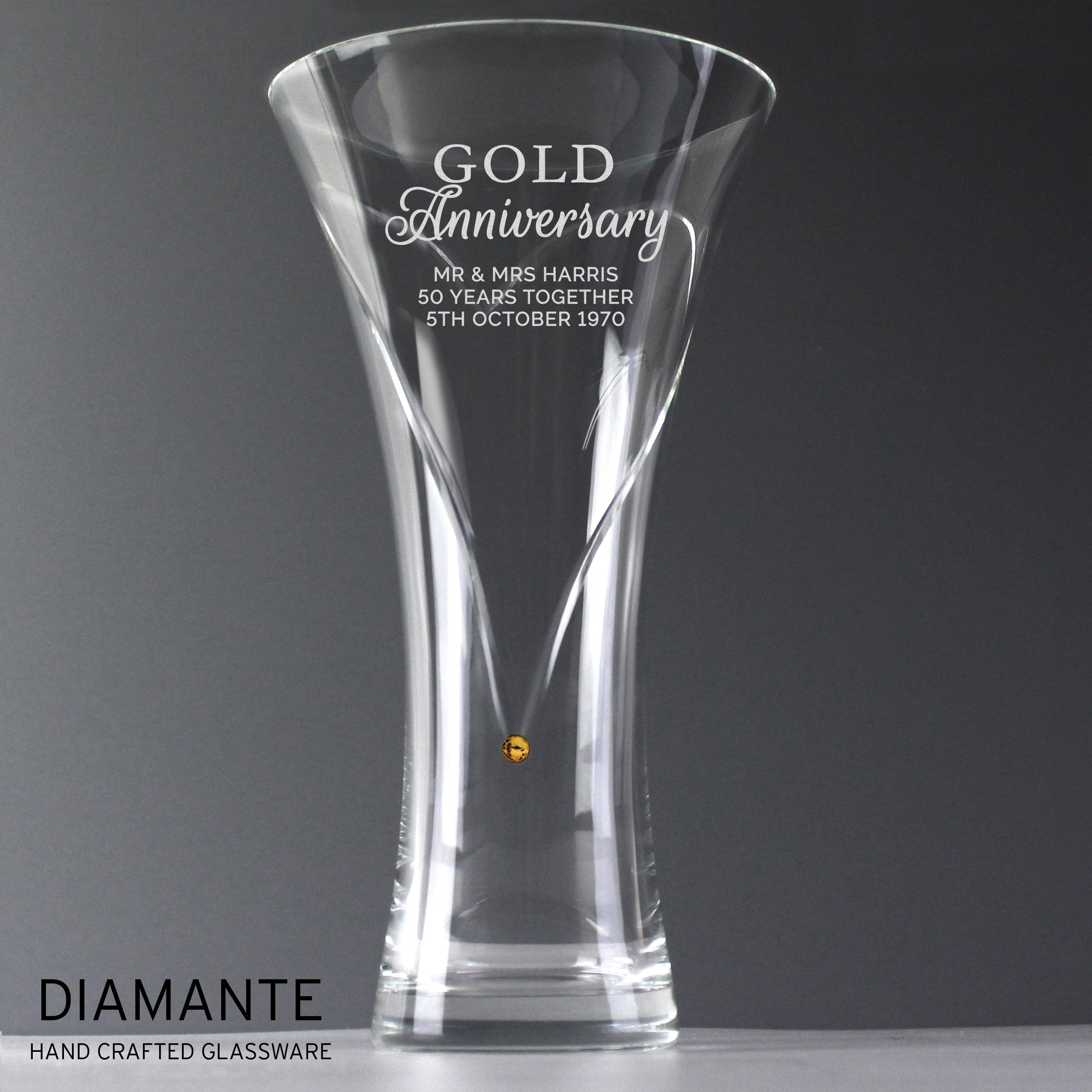 Personalised Gold Anniversary Large Hand Cut Diamante Heart Vase. This beautiful Personalise this Hand Cut large Gold anniversary Diamante Vase with a message up to 3 lines of 20 characters.