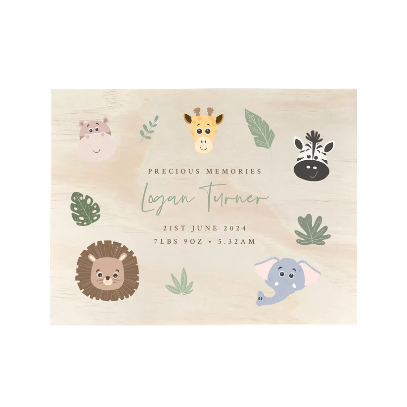 Personalised Jungle Animals New Baby Wooden Memory Box