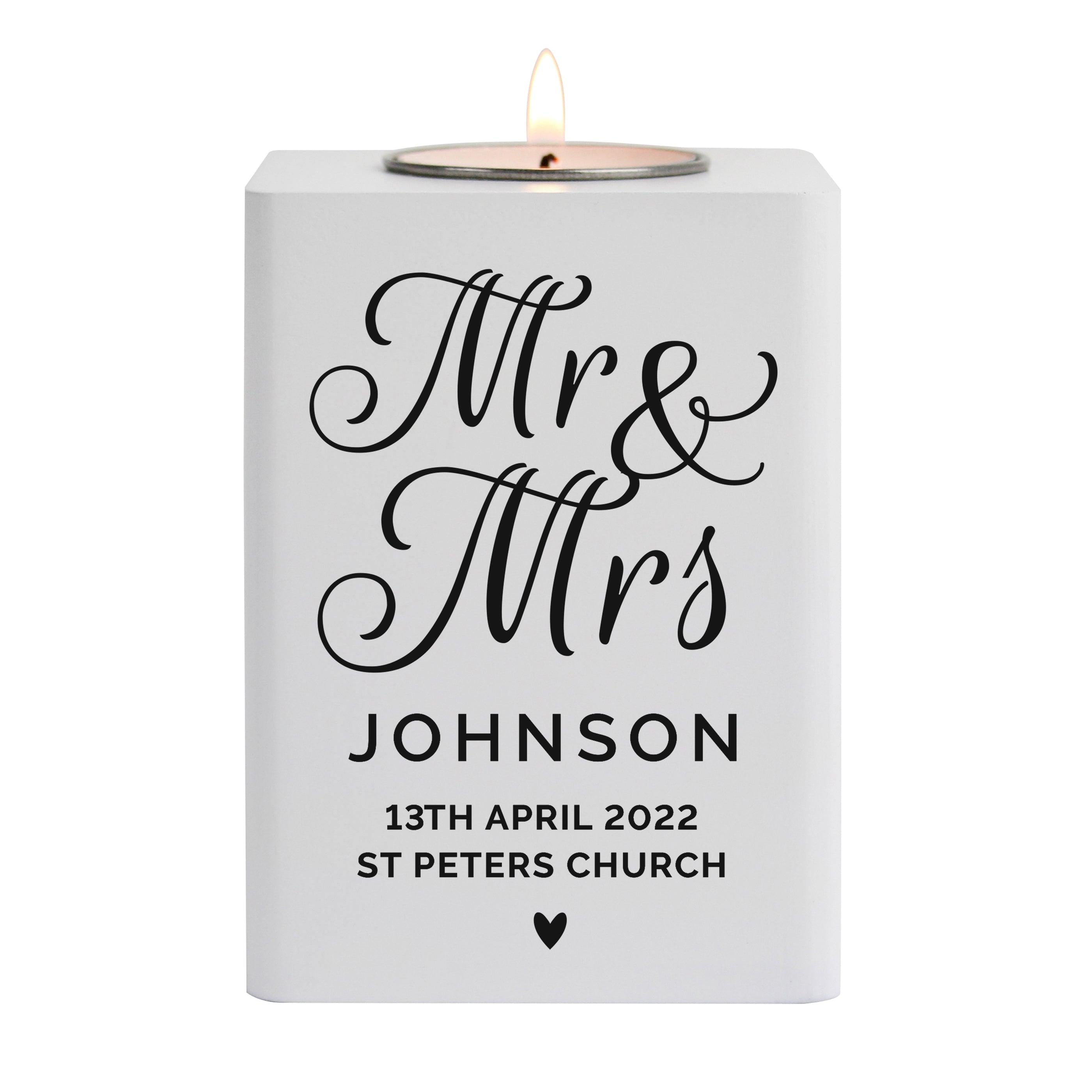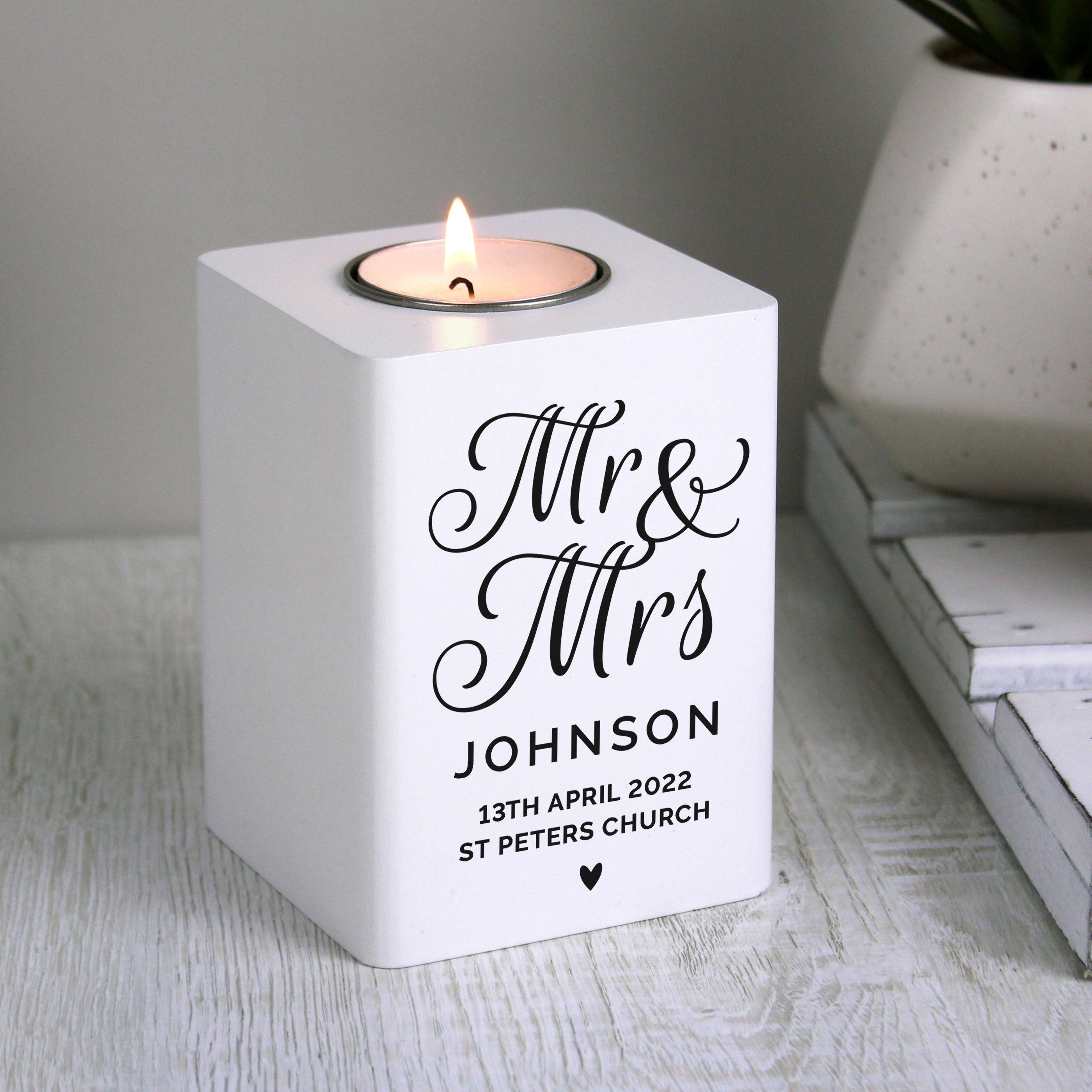 Personalised Mr & Mrs White Wooden Tea light Candle Holder. This tea light holder is perfect for a newly wedded couple.