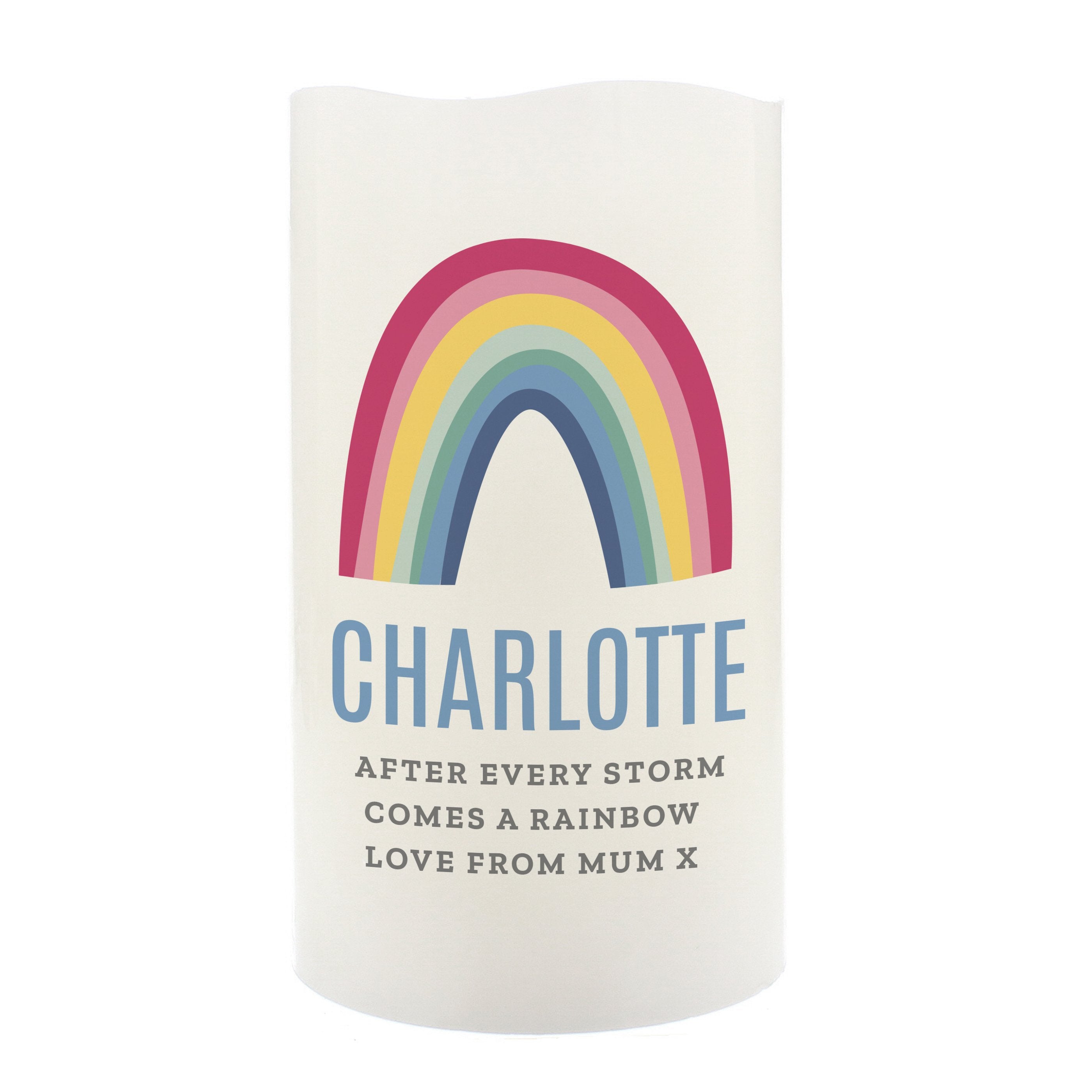 Personalised Rainbow LED Candle. This Personalised Rainbow LED Candle is a perfect gift to give on any occasion. This personalised LED candle is perfect for occasion, bring a ray of sunshine into your home.