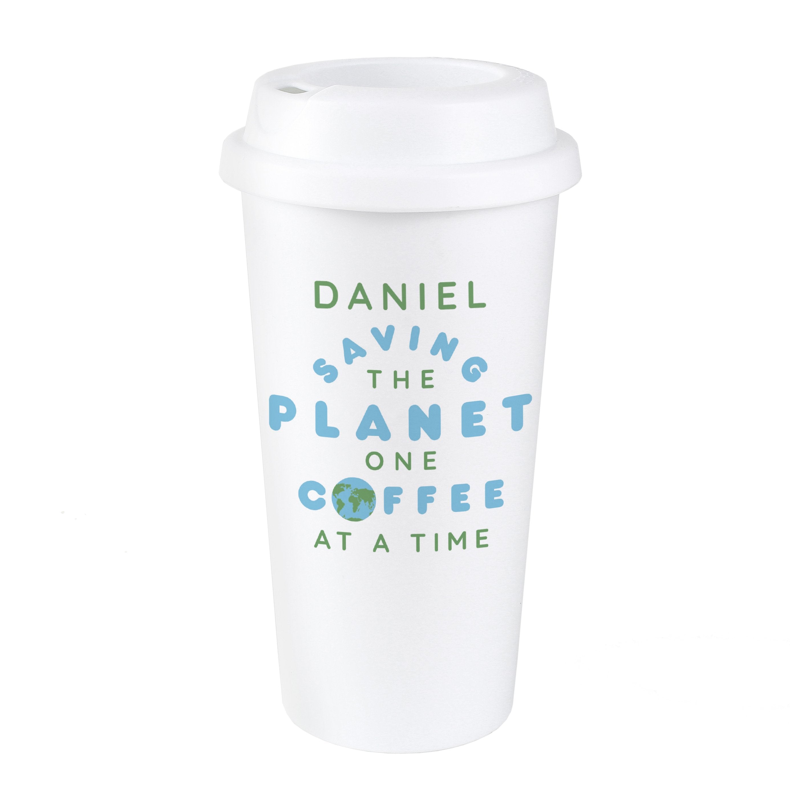 Personalised 'Saving the Planet' Double Walled Travel Mug. This personalised travel mug is a great way to help save the plant by not generating waste from plastic or paper cups from your coffee.