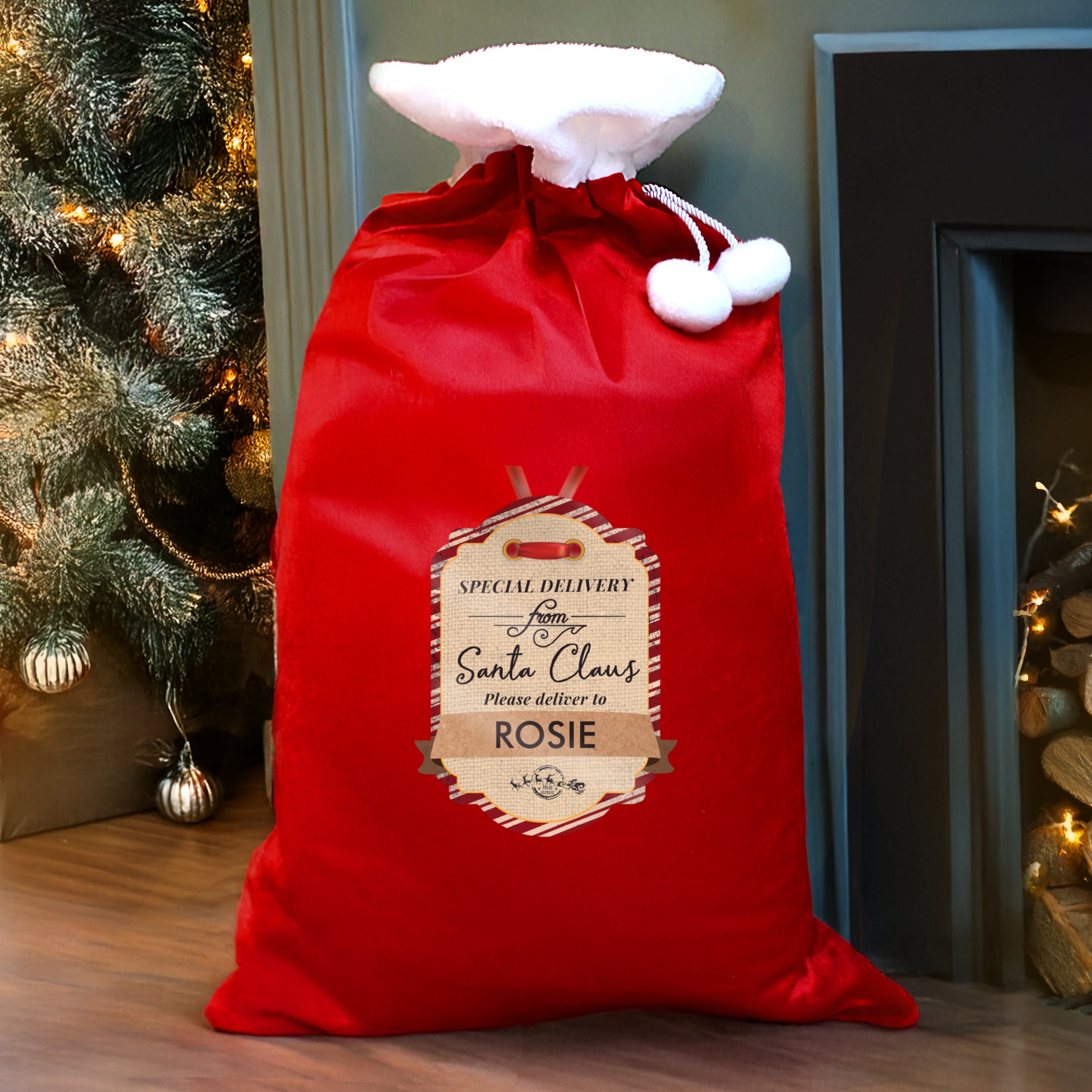 Personalised Special Delivery Luxury Pom Pom Sack for Christmas. Our new Personalised Special Delivery Luxury Sack is a unique and thoughtful way to present Christmas gifts. It can be used year on year to create a truly festive feel!