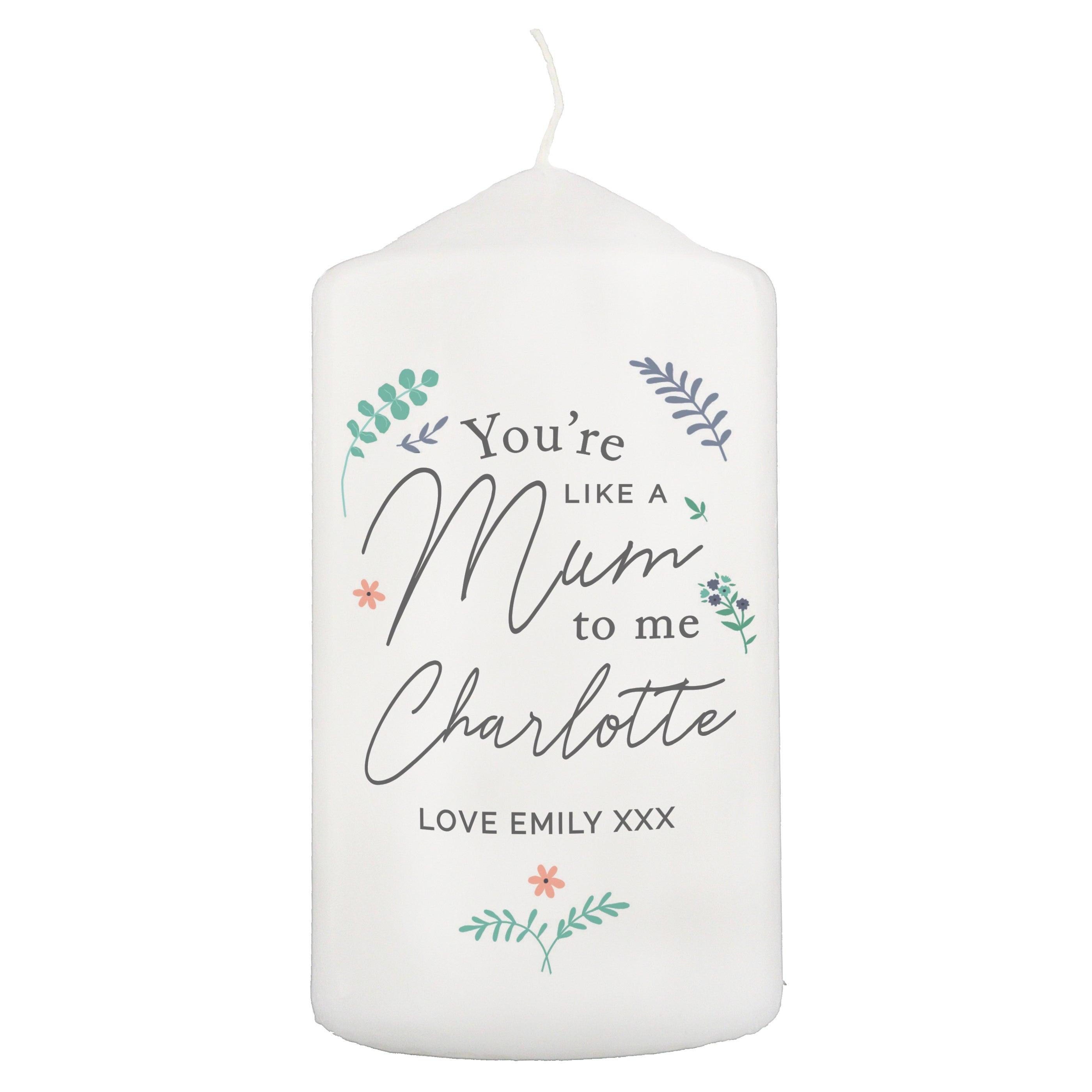 Personalised You're Like A Mum To Me Pillar Candle. This cute Personalised You're Like A Mum To Me pillar candle is a great way to show your appreciation to someone this Mother's Day.