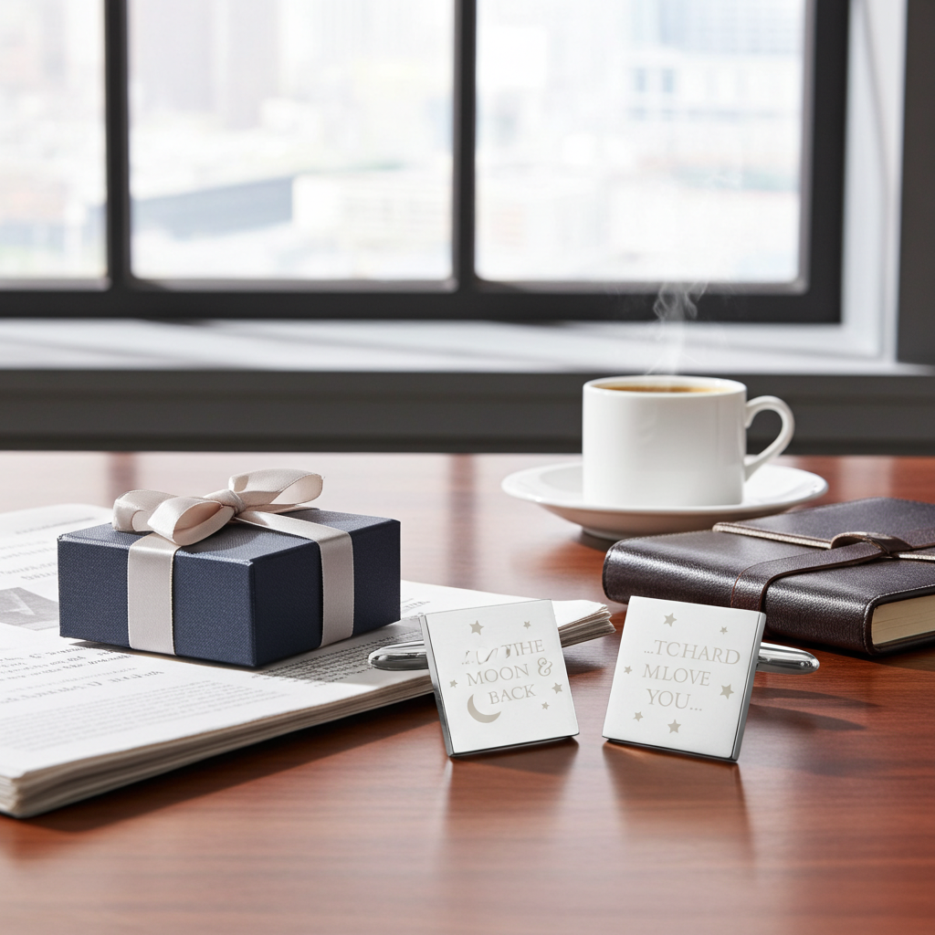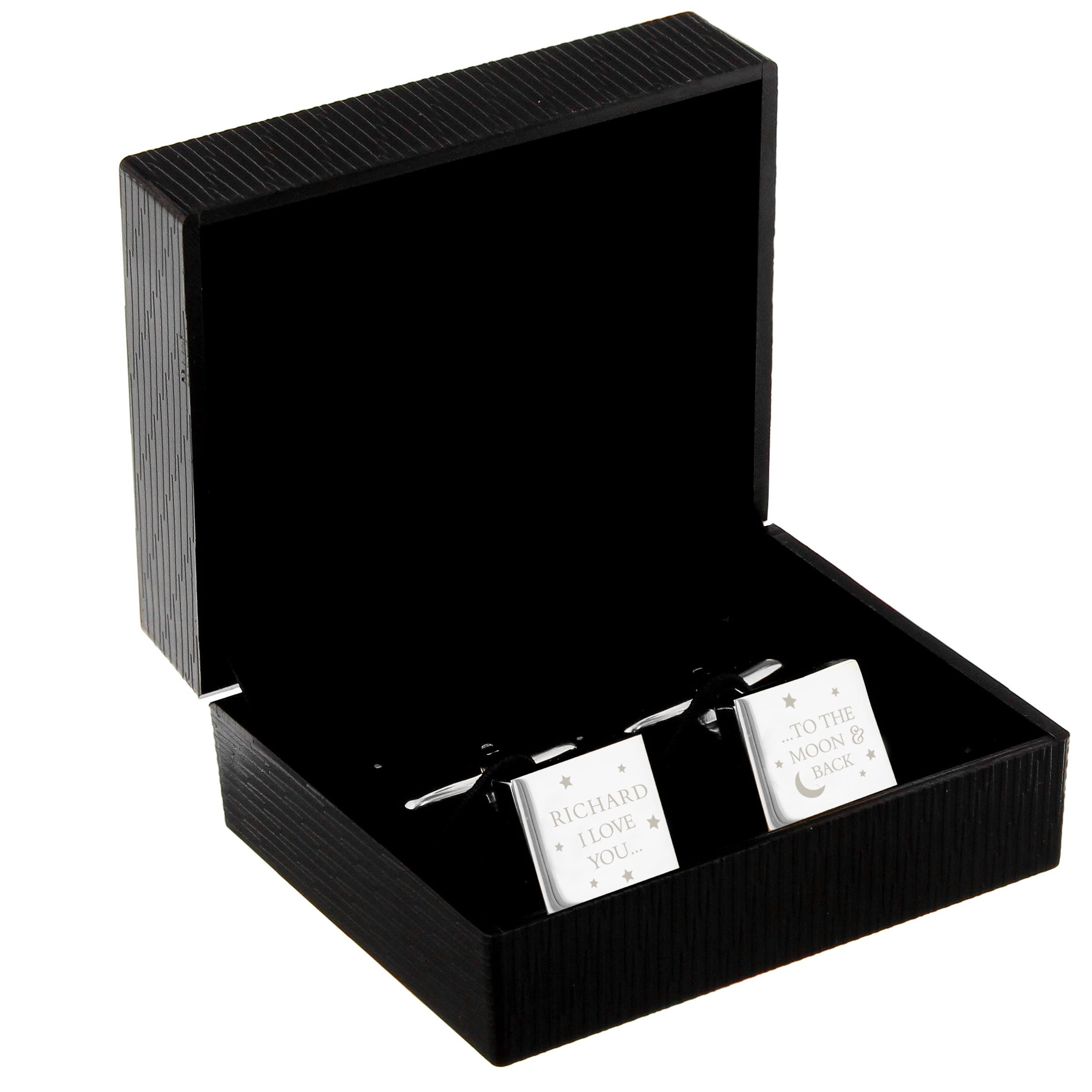 Personalised To the Moon and Back Square Cufflinks. Express your devotion with these exquisite square cufflinks, a romantic gesture that declares your love reaches to the moon and back. Whether for an anniversary, wedding day, or simply to remind your partner how deeply you care, these personalised cufflinks are a sophisticated token of your endless affection.