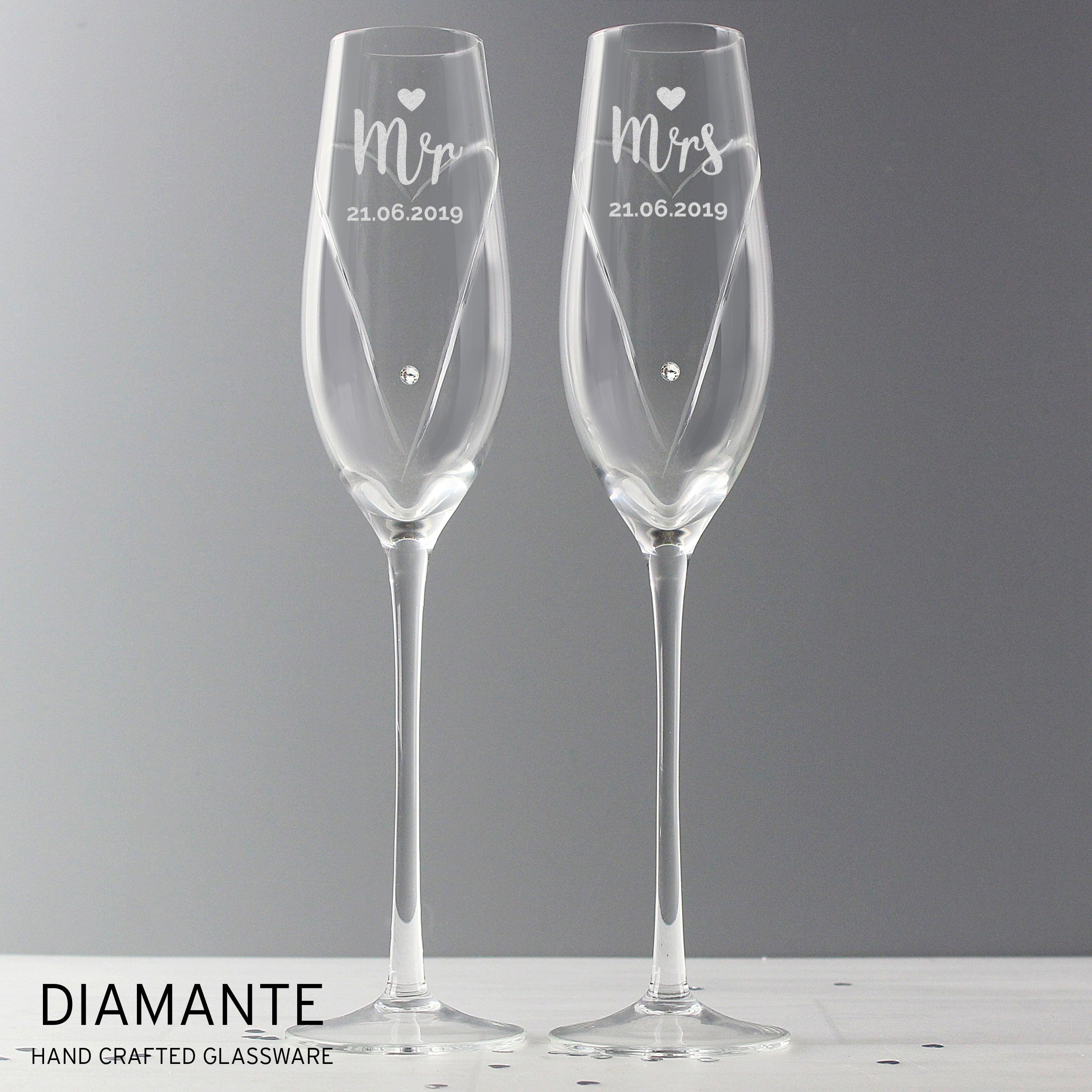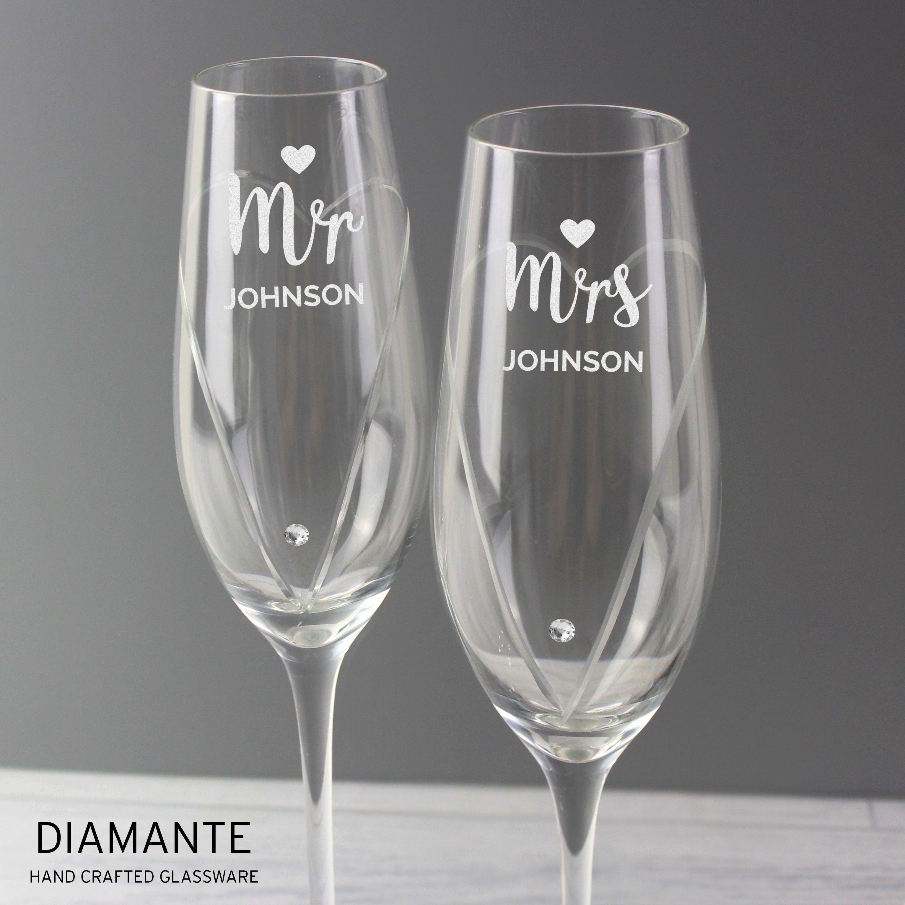 Personalised Hand Cut Mr & Mrs Pair of Flutes in Gift Box. These elegant Personalised Hand Cut Mr & Mrs Pair of Flutes make the perfect gifted for newlyweds.