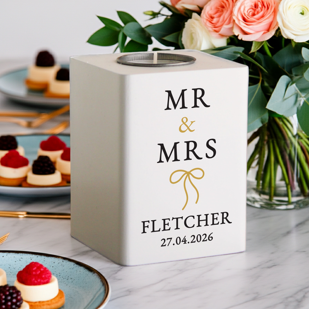 Personalised Black & Gold White Wooden Tealight Holder. Enhance your romantic evenings with this charming white wooden tealight holder. It's an ideal accessory for couples looking to create a cozy and intimate atmosphere. Perfect for setting the mood, this holder beautifully complements any decor while showcasing your love.