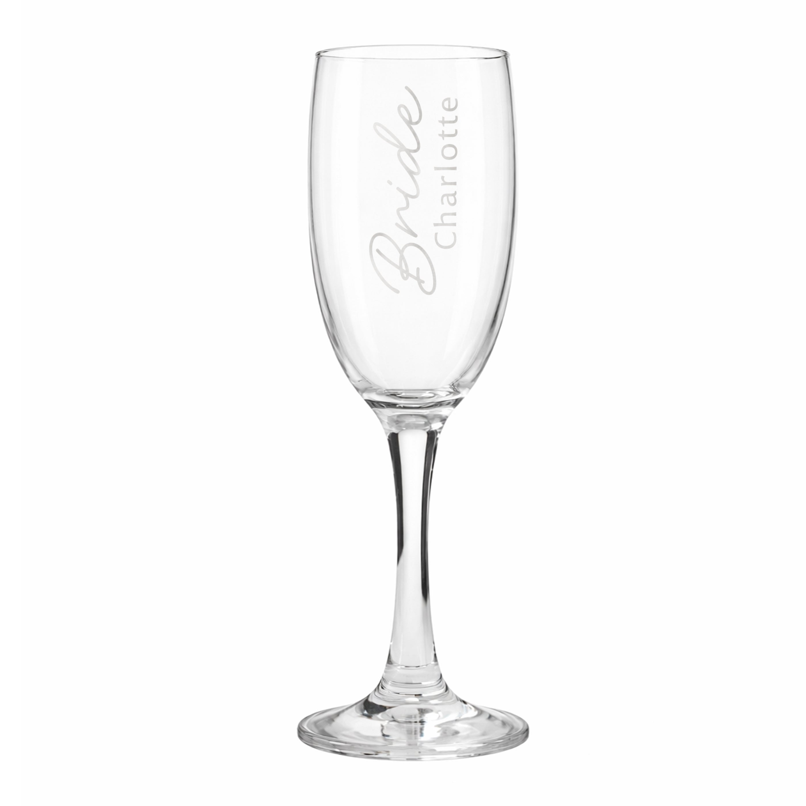 Personalised Bride Elegant Flute Glass. Add a touch of sophistication to your special day with our Personalised Bride Elegant Flute Glass. Perfect for toasting at your wedding, this beautifully designed flute celebrates the bride in style. Whether you're enhancing your wedding decor or looking for a unique gift, this elegant flute brings a personal touch to any occasion. Make your moments memorable with this exquisite addition to your wedding range!